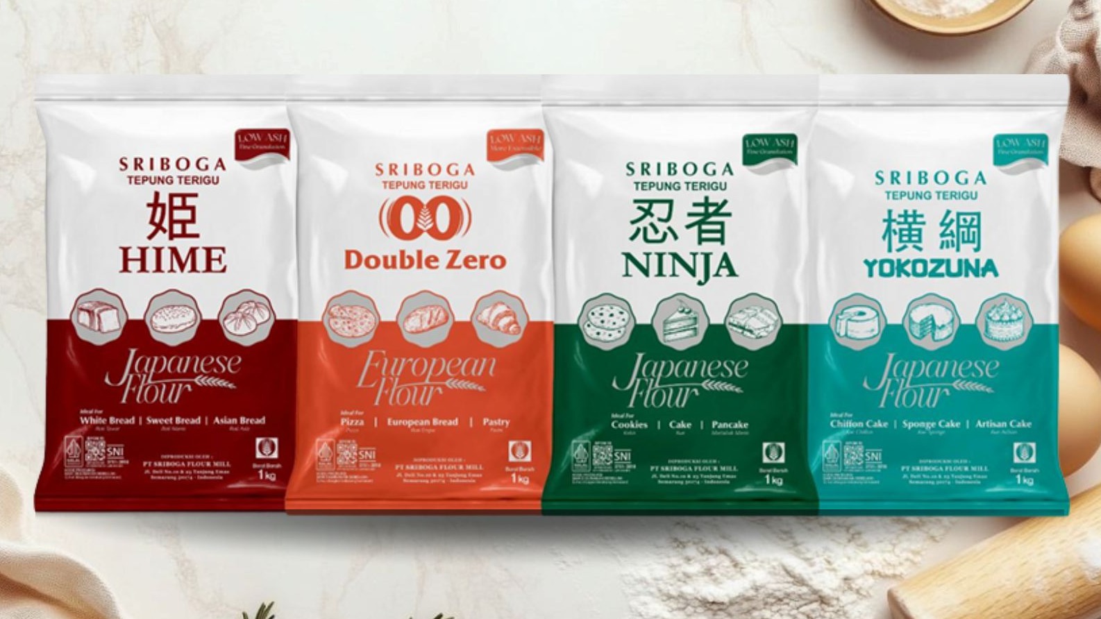 - Contoh Produk Sriboga: Ninja (Tepung kualitas premium untuk martabak manis dan aneka kue kering agar teksturnya pas).
